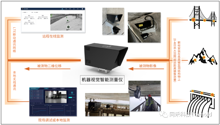 机器视觉智能测量仪内含嵌入式计算模块,可对记录的靶标图像进行畸变处理,校正靶标位移,提高结构物位移的监测精度,实现垂直与水平位移的动静态一体测量;采用动态局部视窗算法,解决了运算复杂和计算量大的问题,所有监测数据都能够在本地微型嵌入式计算模块中运行计算;配套数据管理平台实现端云协作,可根据数据量灵活拓展,降低运维成本,构建数字孪生系统,实现监测数据与模型的动态联动;数据平台具备远程可视化监控与视频分析功能,可避免误报警。