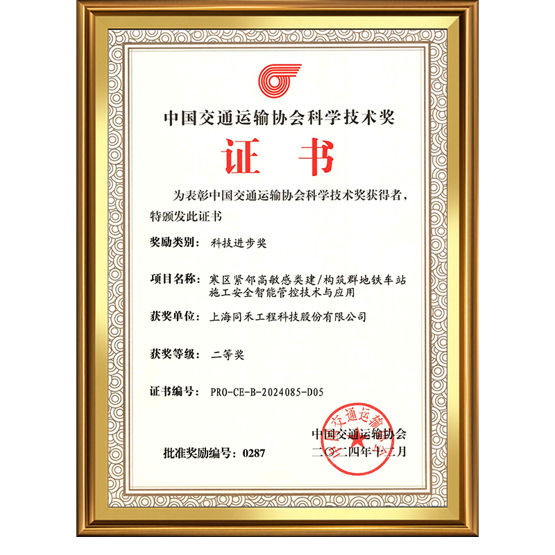 近日,2024年度中国交通运输协会科学技术奖评选结果揭晓,上海同禾工程科技股份有限公司(以下简称“同禾科技”)与中交隧道工程局有限公司、中交一公局第三工程有限公司、哈尔滨工业大学、中交二航局第三工程有限公司共同申报的《寒区紧邻高敏感类建/构筑群地铁车站施工安全智能管控技术与应用》项目荣获科技进步奖二等奖!该奖项经国家科学技术奖励工作办公室批准设立,是交通运输领域全国性行业科技荣誉,旨在表彰具有显著创新性与社会效益的科研成果。
