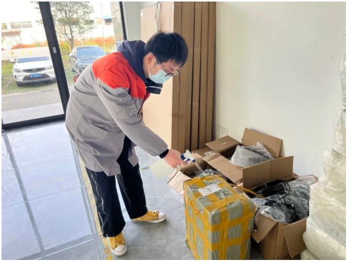每天定点定时对来料物流包装进行消杀,严格执行无接触收发货。此外,积极倡导员工坚持“两点一线”的工作模式,避免去人员聚集场所,中餐尽量自带解决。