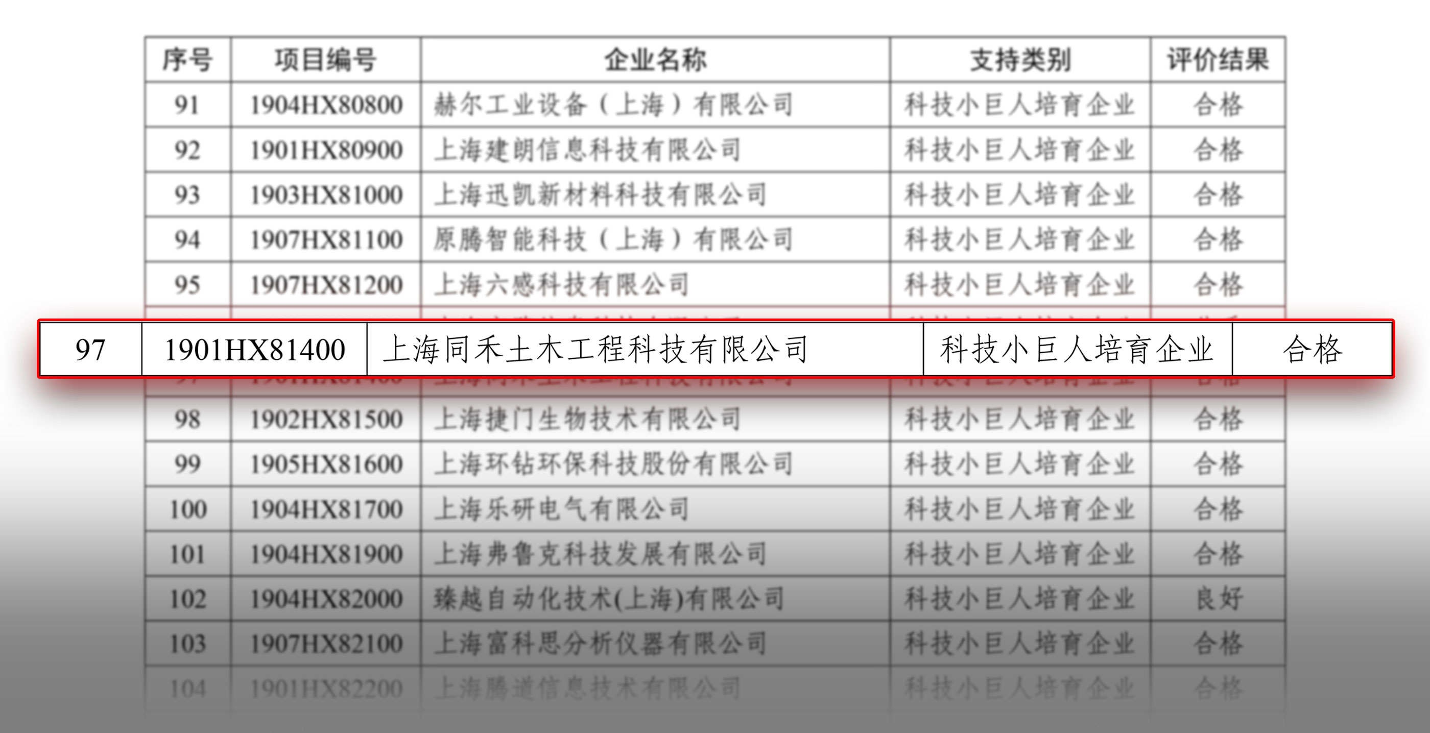 注:上图为《2021年度上海市科技小巨人(含培育) 企业综合绩效评价合格及以上企业名单》部分截图;“上海同禾土木工程科技有限公司”为公司原名称,于2019年6月10日更名为“上海同禾工程科技股份有限公司”。