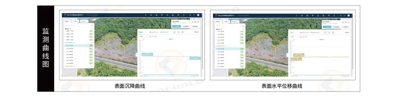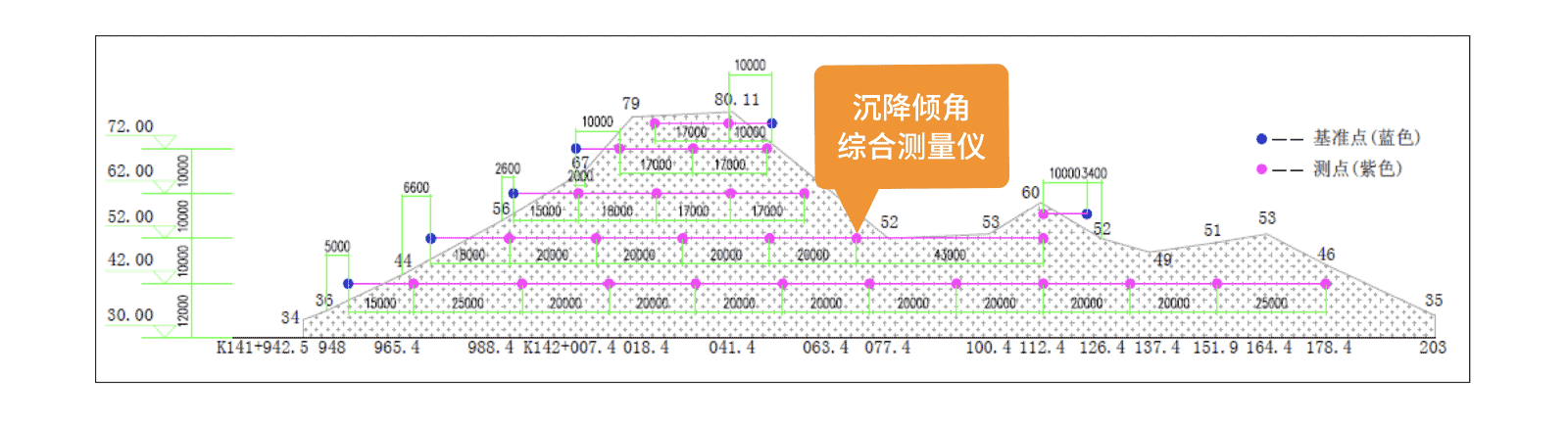 同禾对该工程的7处高度风险边坡做了自动化安全监测。采用沉降倾角综合测量仪进行表层位移监测。其中一处边坡坡高约42m,长度约260m,边坡共5级,按照等高线布设原则共布设5条测线,27个测点。