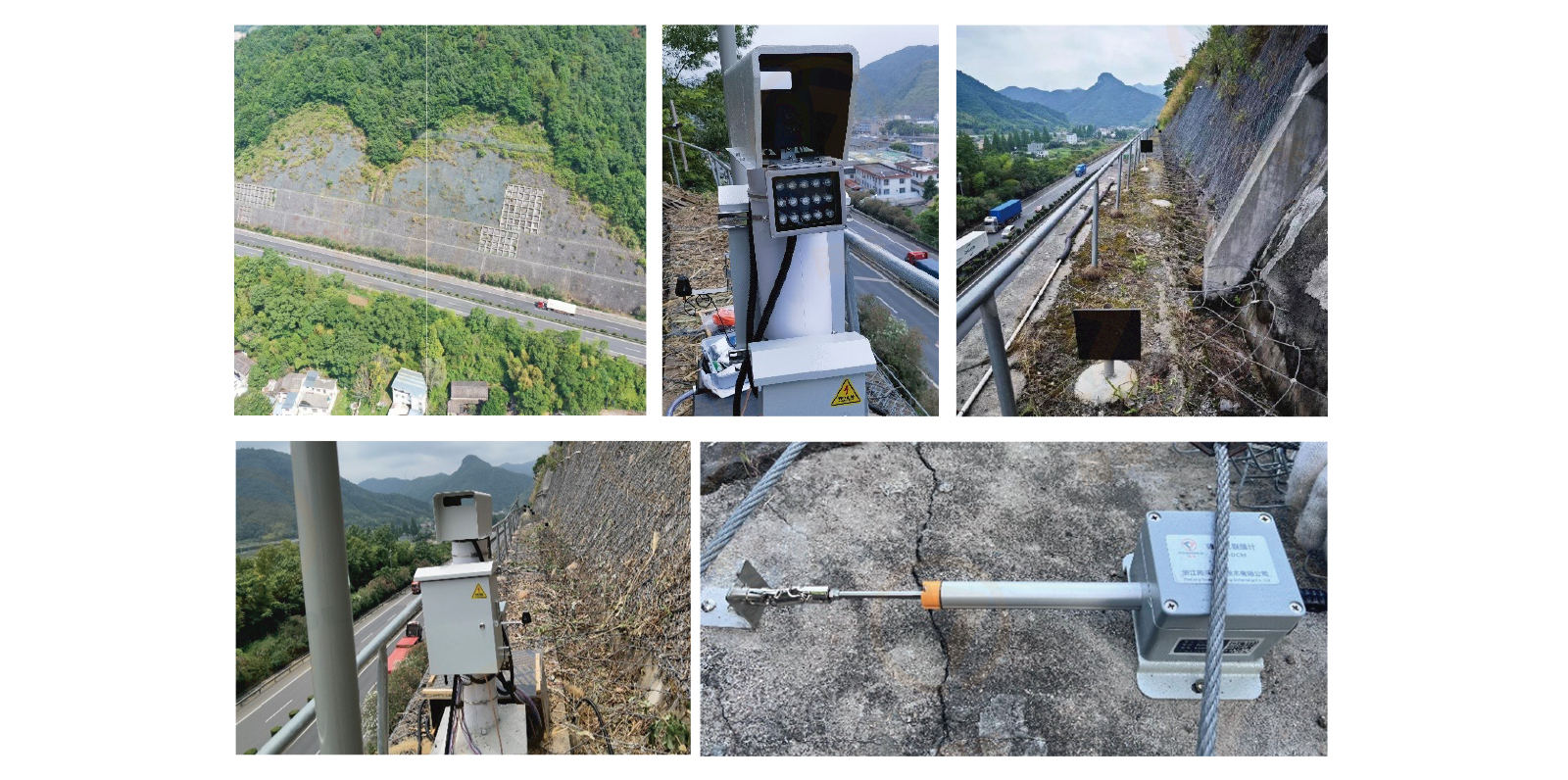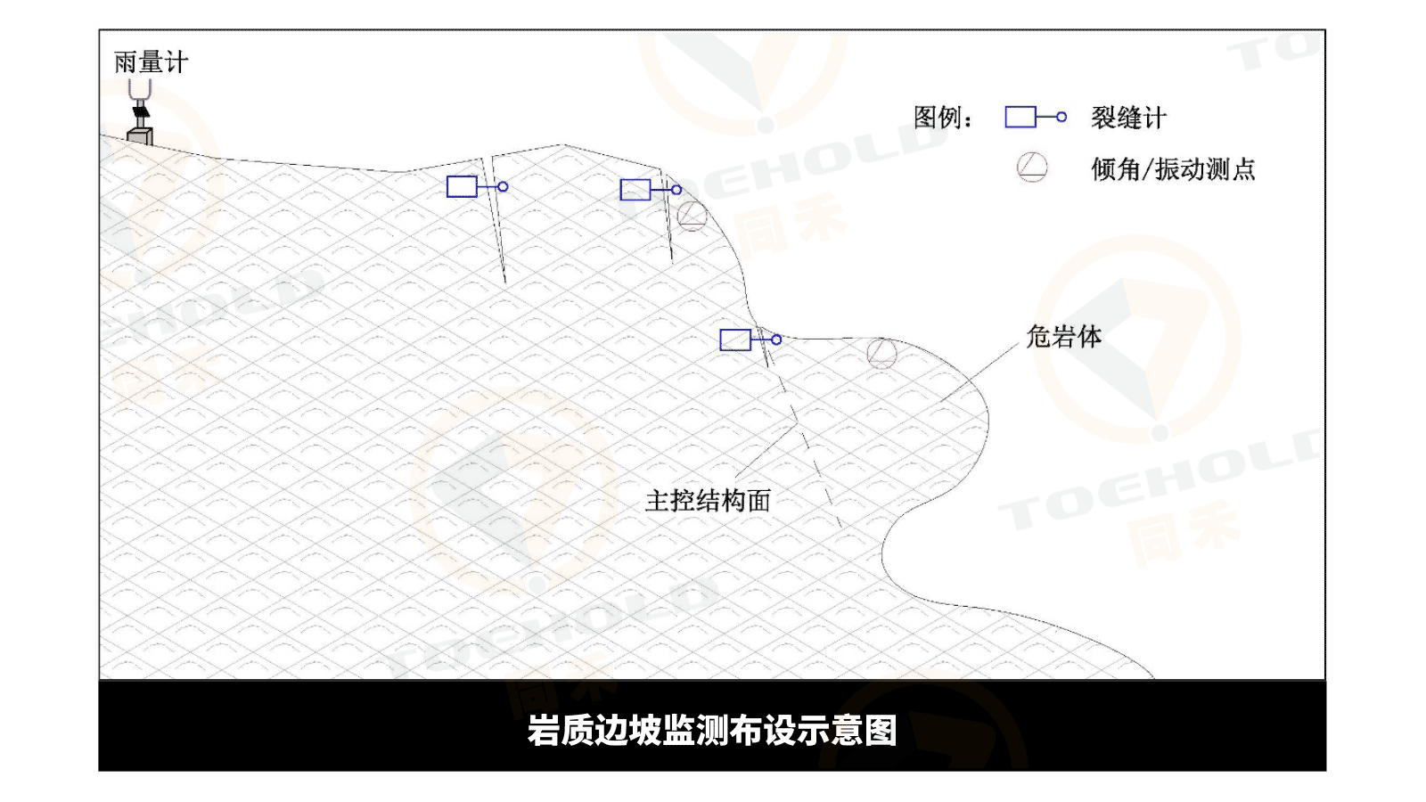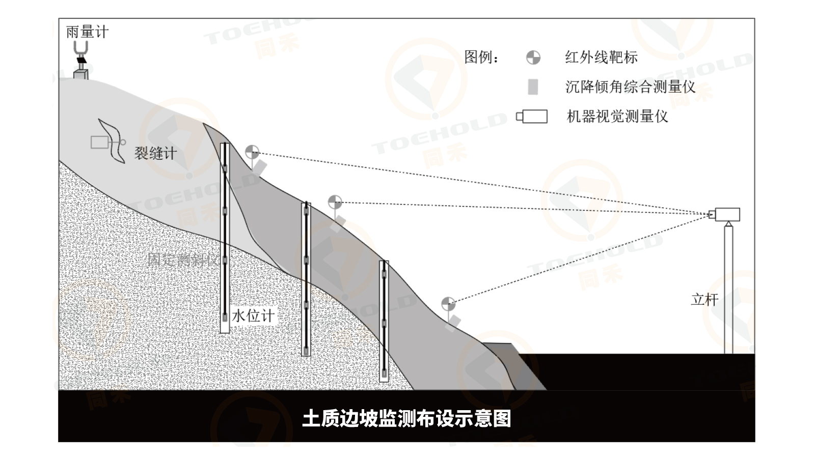 在被监测的边坡上布设一系列智能传感器来监测边坡结构安全的相关数据,这些数据通过网络实时上传到云端,经系统分析与解算后,识别边坡的变化规律,实现提前预警。