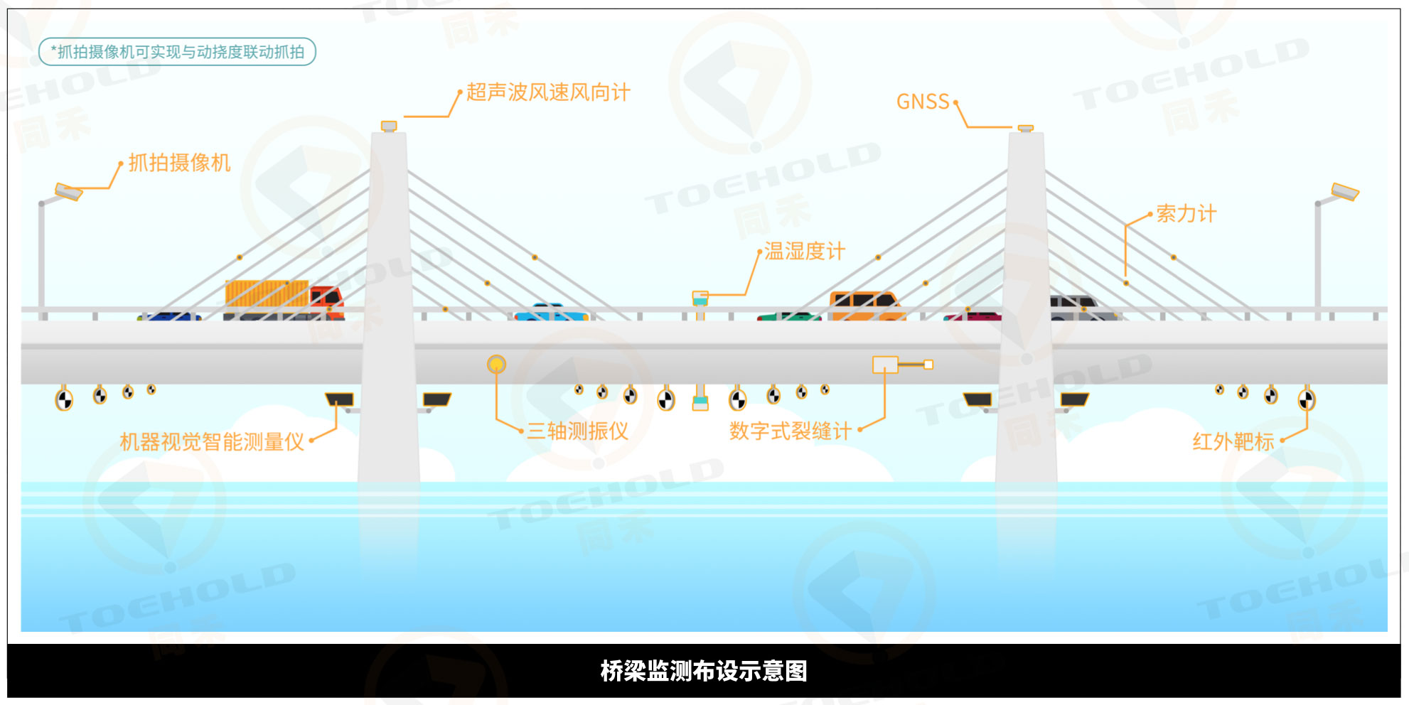 动挠度测点主要布设在主跨的跨中部位,梁底布设,每断面布设4-8个测点;超载抓拍布设在桥面人行道对应部位,同时对所有车道进行超载抓拍。